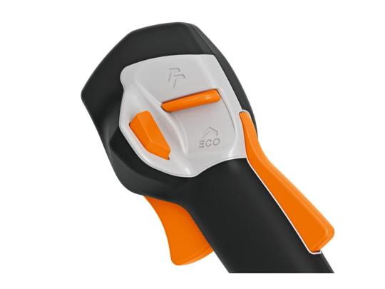 De borstelloze EC-motor is voorzien van een 2-traps variabele snelheidsregeling, waarmee je het toerenal direct op de bedieningshendel kan aanpassen aan je behoeften. Als je met een laag toerental wilt werken, bijvoorbeeld voor lichtere klussen, zoals het onderhoud van gazonranden, kies je best voor de ECO-modus (niveau 1). Dit vermindert het energieverbruik en verlengt de levensduur van de accu. Om struikgewas en dicht gras te maaien, heb je echter het volle vermogen van je machine nodig. Selecteer in dat geval gewoon stand 2. Het toerental past zich automatisch aan het gemonteerde snijgereedschap aan en kan traploos worden ingesteld.